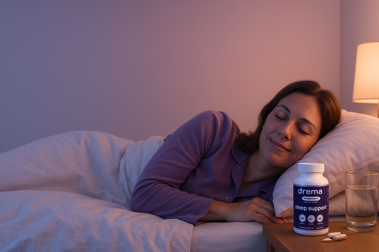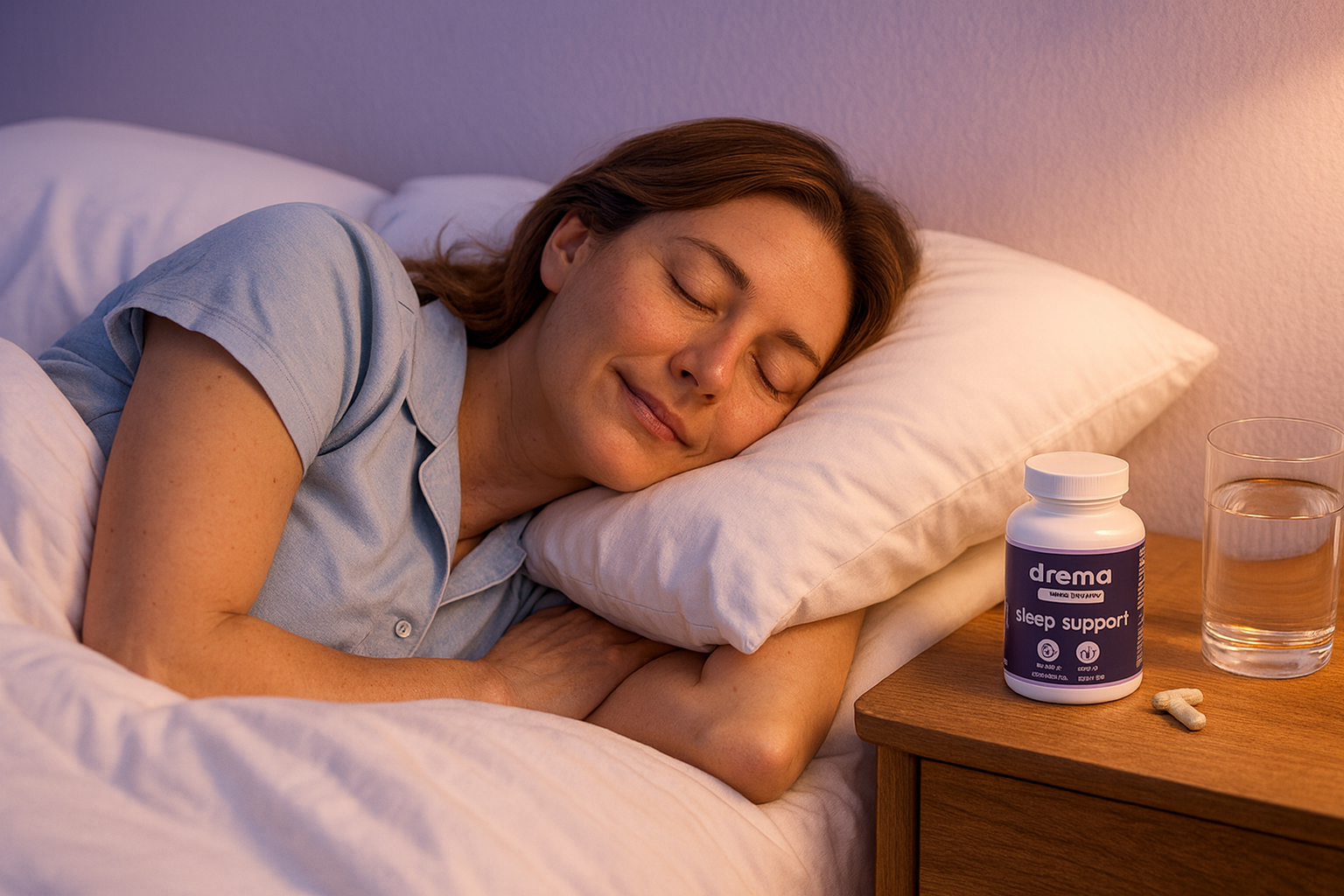 How drema™ Supports Full-Cycle Sleep: Magnesium citrate helps your body release tension. Melatonin supports your natural sleep rhythm. Vitamin B6 and a calming botanical and amino blend support a quieter mind and steadier sleep through the night.
