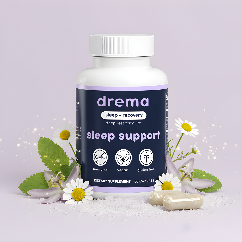 Drema uses a full-cycle sleep stack: magnesium citrate and vitamin B6 to help your body relax, melatonin to support your natural sleep rhythm, and a proprietary calming blend of botanicals and amino support like chamomile, lemon balm, passion flower, GABA, L-theanine, and 5-HTP to help quiet the mind and support deeper sleep.